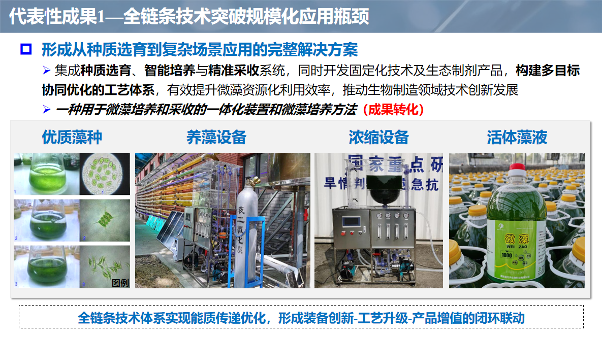 通过微藻全链条技术体系突破产业化瓶颈,构建藻种定向驯化、光生物反应器驱动培养与联产应用三位一体系统。