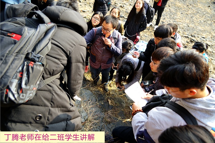 中午,在桂子山实习结束后,同学们和老师们各自拿出自己的午餐补充体力。饭后之余,学生与老师玩起了“撕名牌”游戏,一显示了地球科学苦中取乐的积极向上的精神,二增进了学生与学生之间、学生与老师之间的感情。随后,全体师生乘车前往本次实习的另一地点六合方山。同学们首先对山脚裸露的沉积岩考察学习,并在老师的带领下进行了对雨花石的寻找,更加深了同学们对不同岩石的地学认知。而后,师生们登上方山,考察了方山的古火山口与猫耳石,通过对方山的形成过程的了解掌握了更多的地学研究方法。