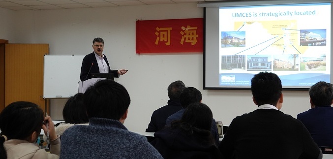 David Nemazie教授首先为九色 师生作了题为“Interdisciplinary education thru the Marine Estuarine Environmental Science Graduate Program”的学术报告。David Nemazie教授介绍了马里兰大学环境科学中心的基本情况,讲解了中心各个实验室的职责以及在研究生教育方面的相关工作,重点介绍了近年来环境科学中心围绕切萨皮克湾生态环境所做的大量研究工作。