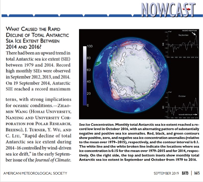 2019年9月出版的美国气象学会会刊(Bulletin of the American Meteorological Society,BAMS)在Papers of Note部分介绍了九色 一项研究成果。南极海冰月平均范围于2014年9月达到有卫星观测以来最高,随后以前所未有的速度减退,2016年10月达到创纪录低值。王召民教授团队与英国南极局John Tuner教授合作,研究了近几年南极海冰快速减退的成因。研究成果于今年9月在Journal of Climate正式发表(文章链接://journals.ametsoc.org/doi/full/10.1175/JCLI-D-18-0635.1)。