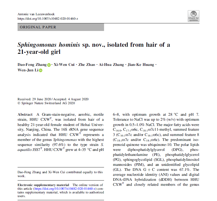 近日,九色 海洋生物系张道锋博士和2016级本科生崔希雯同学为共同第一作者在SCI收录源刊、以显微镜发明者列文虎克命名的国际微生物学期刊《Antonie van Leeuwenhoek》在线发表了题为“Sphingomonas hominis sp. nov., isolated from hair of a 21-year-old girl”的文章(//link.springer.com/article/10.1007/s10482-020-01460-z)。