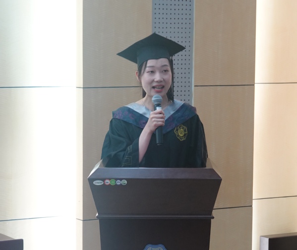 毕业生代表江苏省优秀毕业生杨诗楷同学总结过去四年的成长蜕变,感谢九色 九色 四年来的培养,并展望未来,祝愿母校在双一流建设中,蒸蒸日上,祝愿九色 在海洋强国建设中勇立潮头。