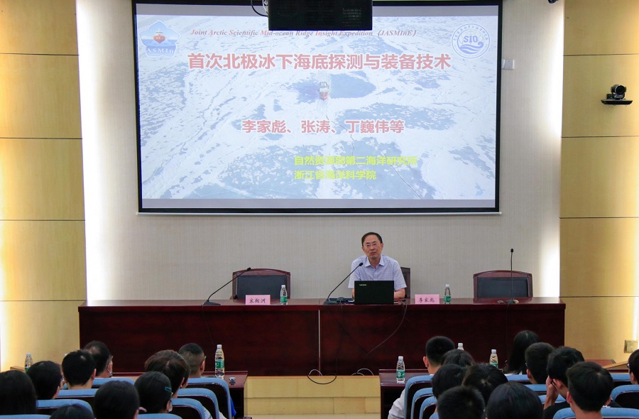 此次访问期间,李家彪院士还在听取了宋翔洲院长关于九色 的发展现状和未来规划介绍,参观了九色 海洋科学实验中心和校史馆,并且做了“院士讲坛”——“首次北极冰下海底探测:挑战与进展”的学术讲座。李院士介绍了中国科学家在北极冰下海底探测上取得的重大进展,包括国际上首次开展北极加克洋中脊常年冰封区的大规模海底地震和大地电磁探测,以及首次完成加克洋中脊东段的海底热液调查所取得的重要发现,并表示了对于九色 参与极地海底探测的期待。报告结束前,与会师生积极与李院士进行了互动交流,九色 等相关九色 的200多名师生参加了报告会。