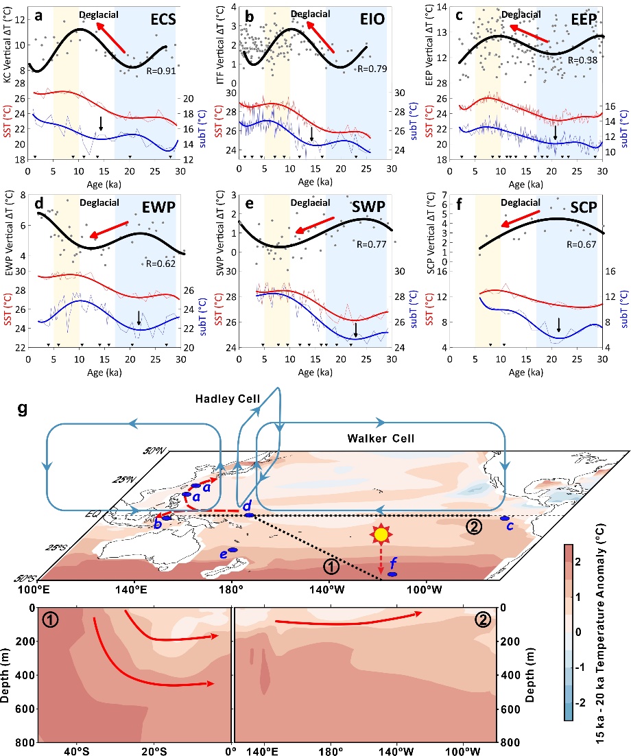 结果显示:1)热带太平洋在末次冰期处于类厄尔尼诺的状态,冰消期时热带太平洋表层水的纬向温差增大,呈现出类拉尼娜的热状态,进入全新世后再次转向类厄尔尼诺态,而该类ENSO状态的转化主要受地球轨道岁差的调控(图二)。2)现代28°C暖池约出现于1.2万年前,对应岁差极小值和类拉尼娜态鼎盛期,其热含量也达到最大值,并在此后,暖池开始显著扩张(图三)。3)西太平洋暖池与东赤道太平洋和西南太平洋位于南大洋翻转环流路径上的次表层水温度在冰消期的升温约开始于2.2万年前,对应于暖池热含量的升高与岁差极大值,而超前于表层海水温度变化,可能源于冰消期浅层翻转环流将南大洋积累的过量热的向赤道输运(图四)。