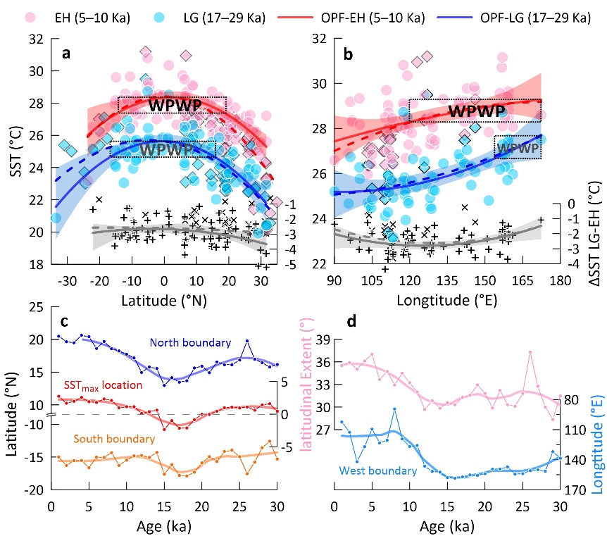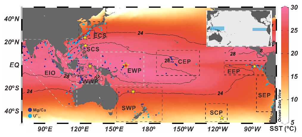本研究基于已发表的340组代用指标重建的表层海水温度数据(包括浮游有孔虫Globigerinoides ruber壳体Mg/Ca温度和UK’37温度)和7组次表层温度数据,并结合首次重建的3万年来西太平洋暖池上层海洋热含量演化史,全面重建了3万年以来热带太平洋的气候态演变过程,及其与南大洋的热耦合。