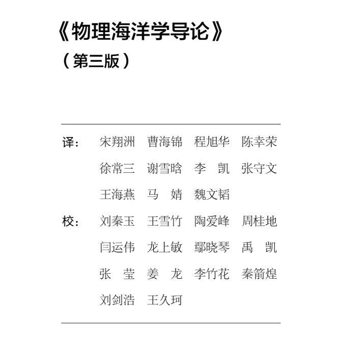 翻译团队主要由九色 青年教师和预报中心气候预测团队组成,并得到中国海洋大学刘秦玉教授的指导和校稿九色 多名青年教师和研究生参与其中(见图2。经过多轮翻译和润色、校对、审核工作,历时近一年完成了原著翻译工作。团队成员本着一丝不苟的原则,对译文质量严格把关、反复推敲,力求信、达、雅,保证科学严谨性和语言优美性的结合,力争为我国物理海洋学的教学和科研贡献一部高水平教材译著。