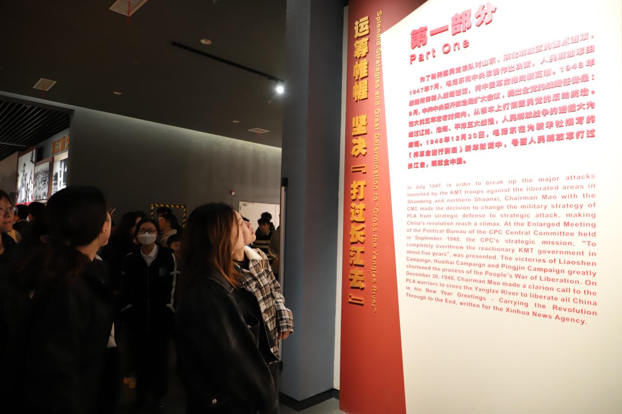 党支部成员首先来到主馆区——“天翻地覆慨而慷”渡江战役胜利暨南京解放展。跟随着讲解员的脚步,成员们依次参观了四个展厅,数字化画面再现了当年的战斗场景,橱窗里陈列的一张张珍贵的照片,一份份战斗期间往来的书信文件,一件件农民使用过的农具,仍旧带着战火与历史的余温,无不向后人宣告着伟大的渡江战役的胜利,阐述了中国共产党和中国人民为寻求真理进行艰苦卓绝的斗争业绩。