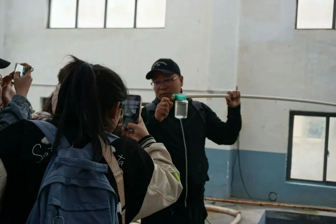 在赣榆区两个实习地点,同学们先后近距离见习了牙鲆、中国对虾、大菱鲆、圆斑星鲽、绿鳍马面鲀、美洲黑石斑等水产品养殖以及鱼贝共养模式,学习和了解了工厂化苗种培育以及增殖放流的技术操作规范。在参观中,工作人员向同学们介绍各种水产品养殖过程的同时,也向同学们科普了颗粒饲料的选择和饲料中各成分的作用,以及养殖污水的处理工艺。通过参观学习,同学们对水产养殖和海洋增殖放流有了更具象的认识。
