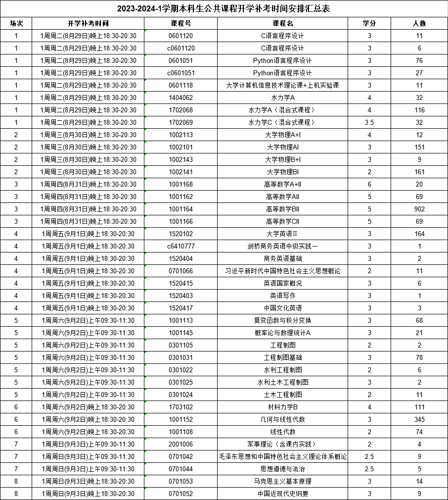 2023-2024-1学期本科生公共课程开学补考时间安排汇总表