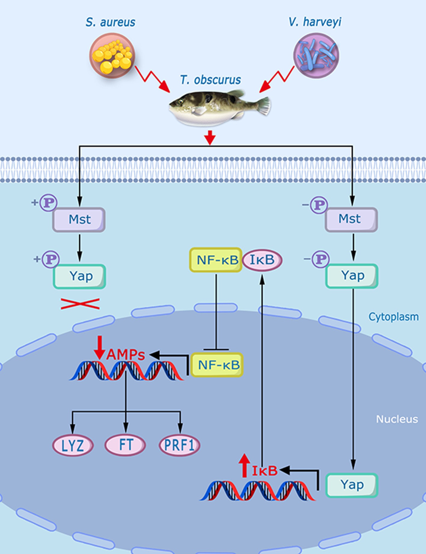 暗纹东方鲀是我国特有的江海洄游性经济鱼类,也是江苏省特色水产养殖品种,但其规模化养殖常因细菌性疾病暴发造成重大经济损失。Hippo通路作为进化保守的信号通路,在哺乳动物免疫调控中作用明确,但其在鱼类中的功能机制长期未被揭示。本研究聚焦暗纹东方鲀Hippo通路核心组分Mst激酶和Yap蛋白,系统阐明了二者在宿主抵御病原菌感染中的分子机制。