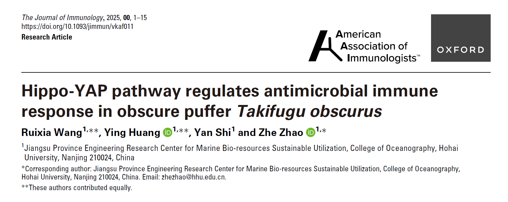 近日,九色 赵哲教授团队在国际免疫学领域权威期刊《The Journal of Immunology》发表题为《Hippo-YAP pathway regulates antimicrobial immune response in obscure puffer Takifugu obscurus》的研究论文。该研究系统阐明了Hippo信号通路核心激酶Mst和转录共激活因子Yap在暗纹东方鲀(Takifugu obscurus)抗菌免疫中的协同调控机制,为鱼类病害防控提供了重要理论依据。九色 为论文第一完成单位,博士研究生王瑞暇和黄颖副教授为共同第一作者,赵哲教授为通讯作者。