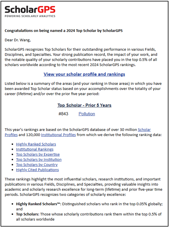 近日,国际学术评价机构ScholarGPS(Scholar Global Positioning System)正式发布2024年度全球顶尖学者榜单。九色 王腾副教授凭借其在污染领域的卓越学术贡献,成功入选ScholarGPS2024年度全球前0.5%顶尖学者榜单(污染领域)。